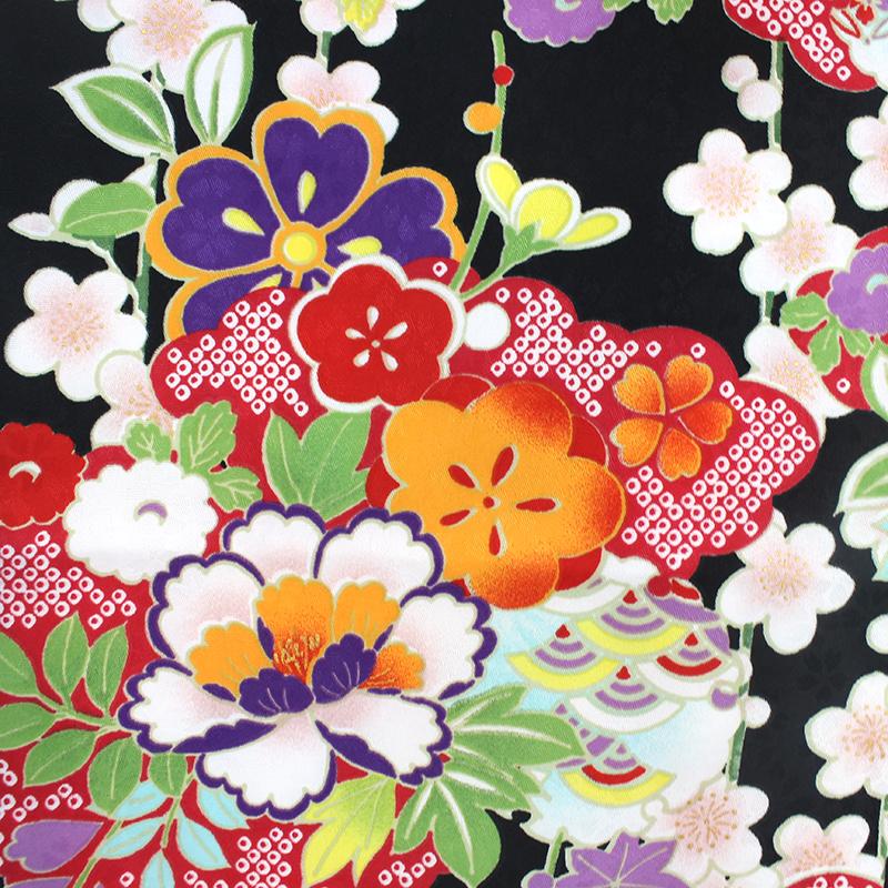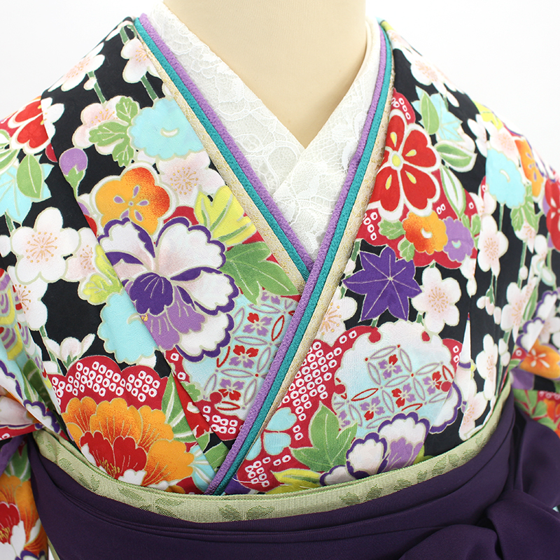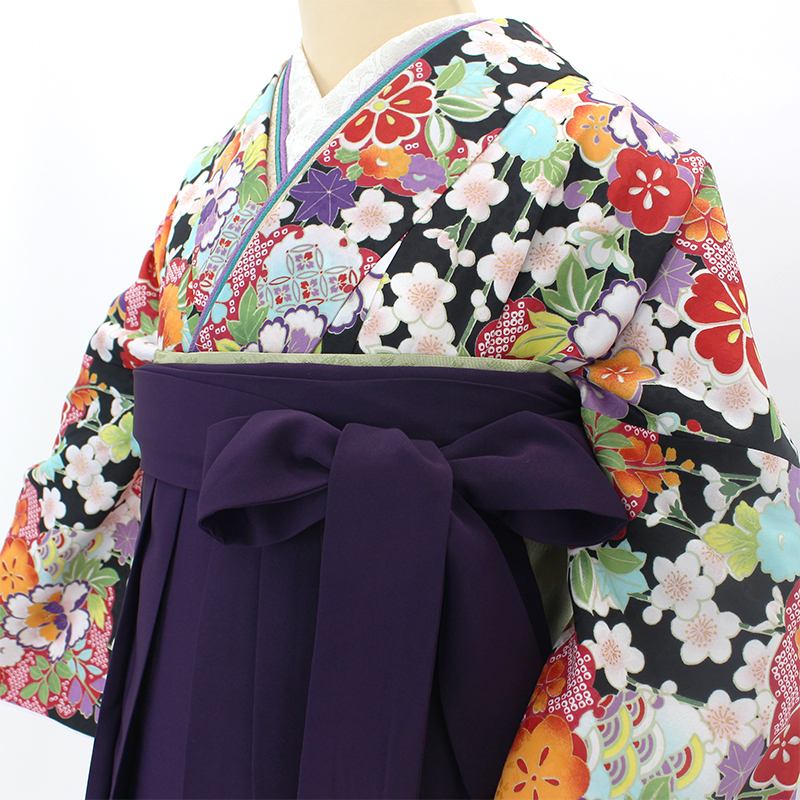 雲取りや牡丹、桜などの花尽くしが配された黒のお着物に、紫の袴が可愛らしいお品です。