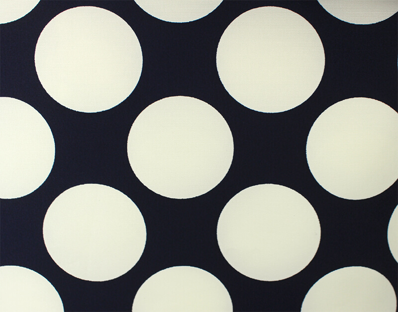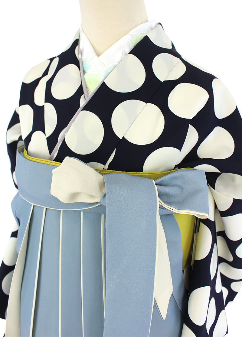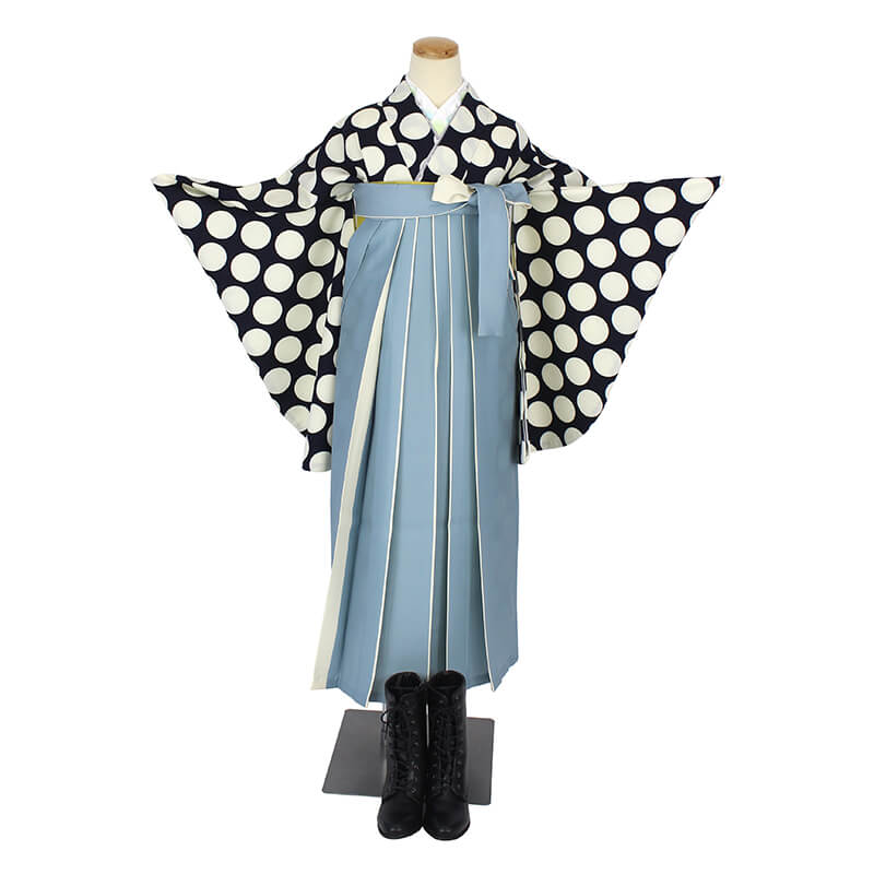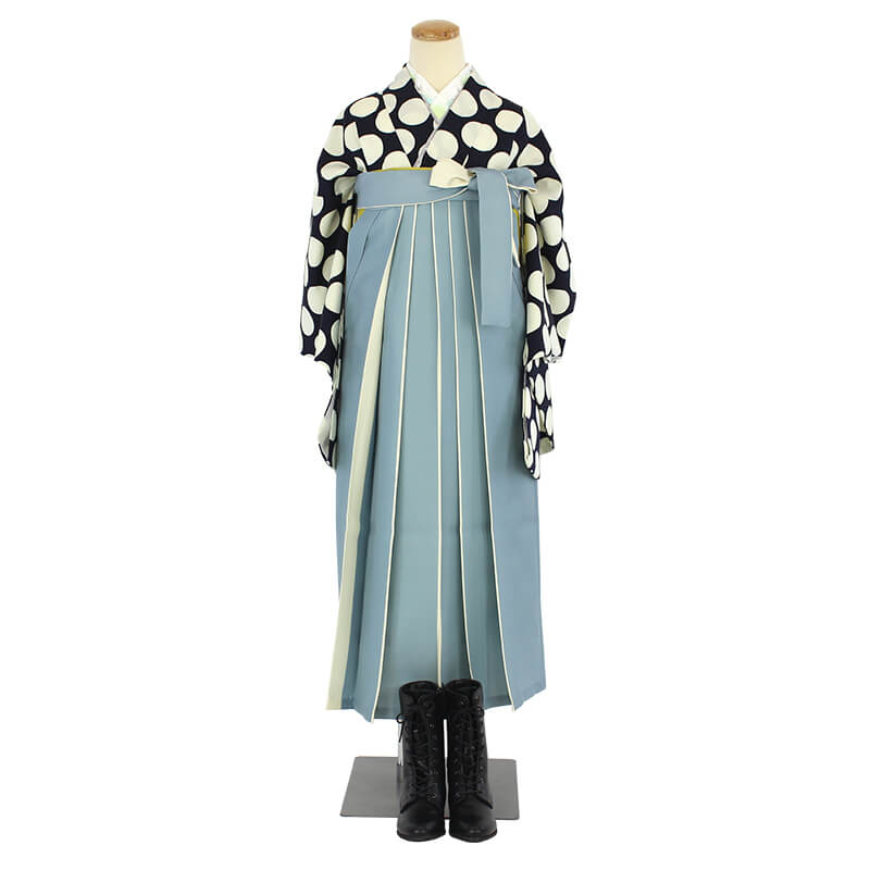 ネイビーと白の配色の大きな水玉柄のお着物に、水色とオフホワイトの配色の袴がおしゃれなお品です。