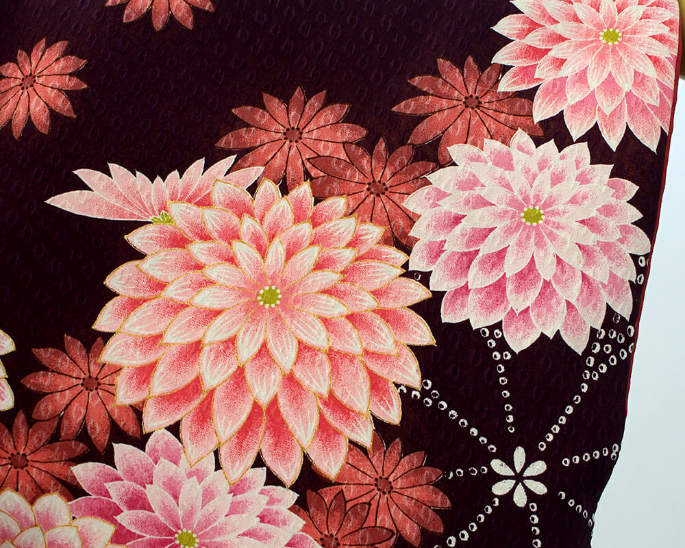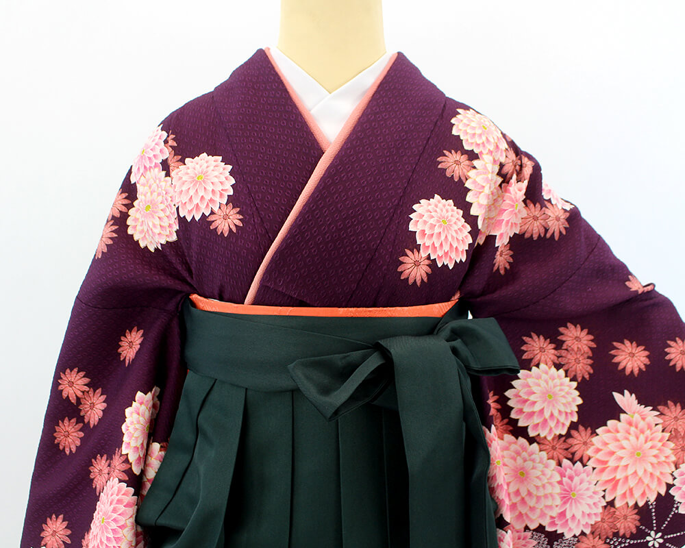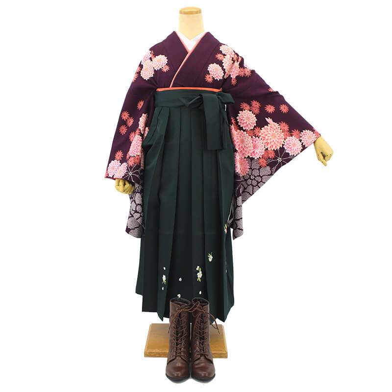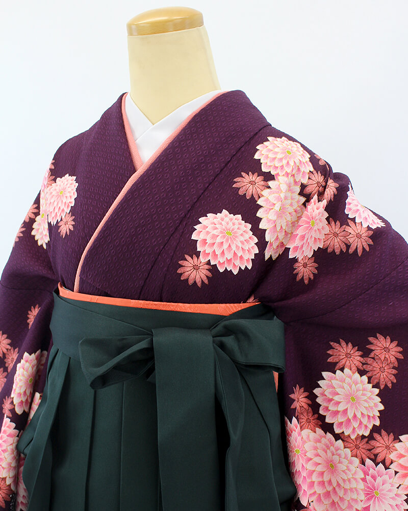 落ち着いた紫の地にピンクの菊が可愛らしい二尺袖に桜の刺繍が入った緑の袴セットです。