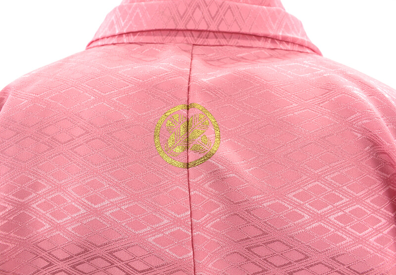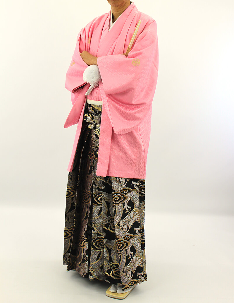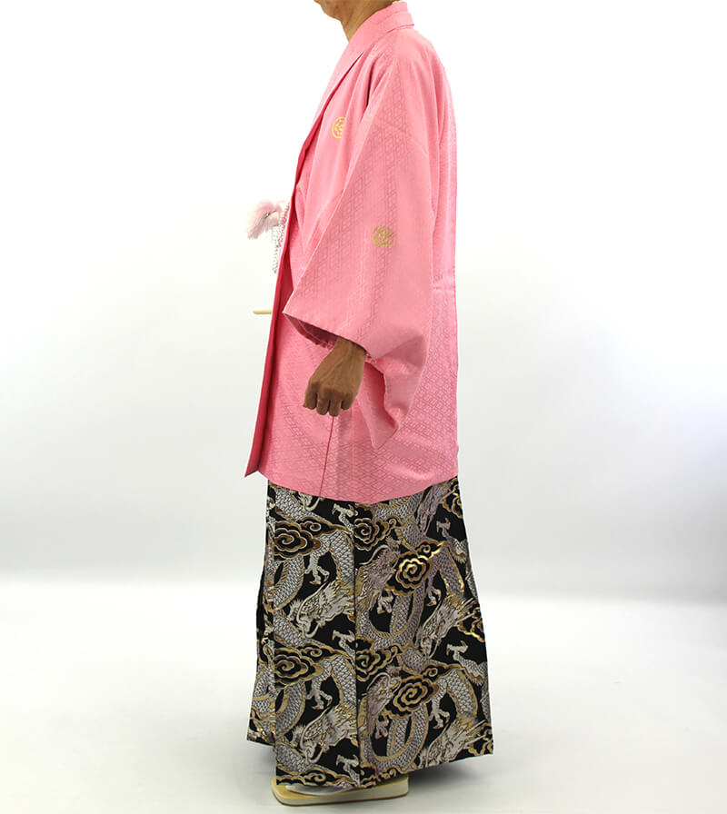 菱の地模様があるピンクの羽織着物に、龍の袴が印象的なセット。