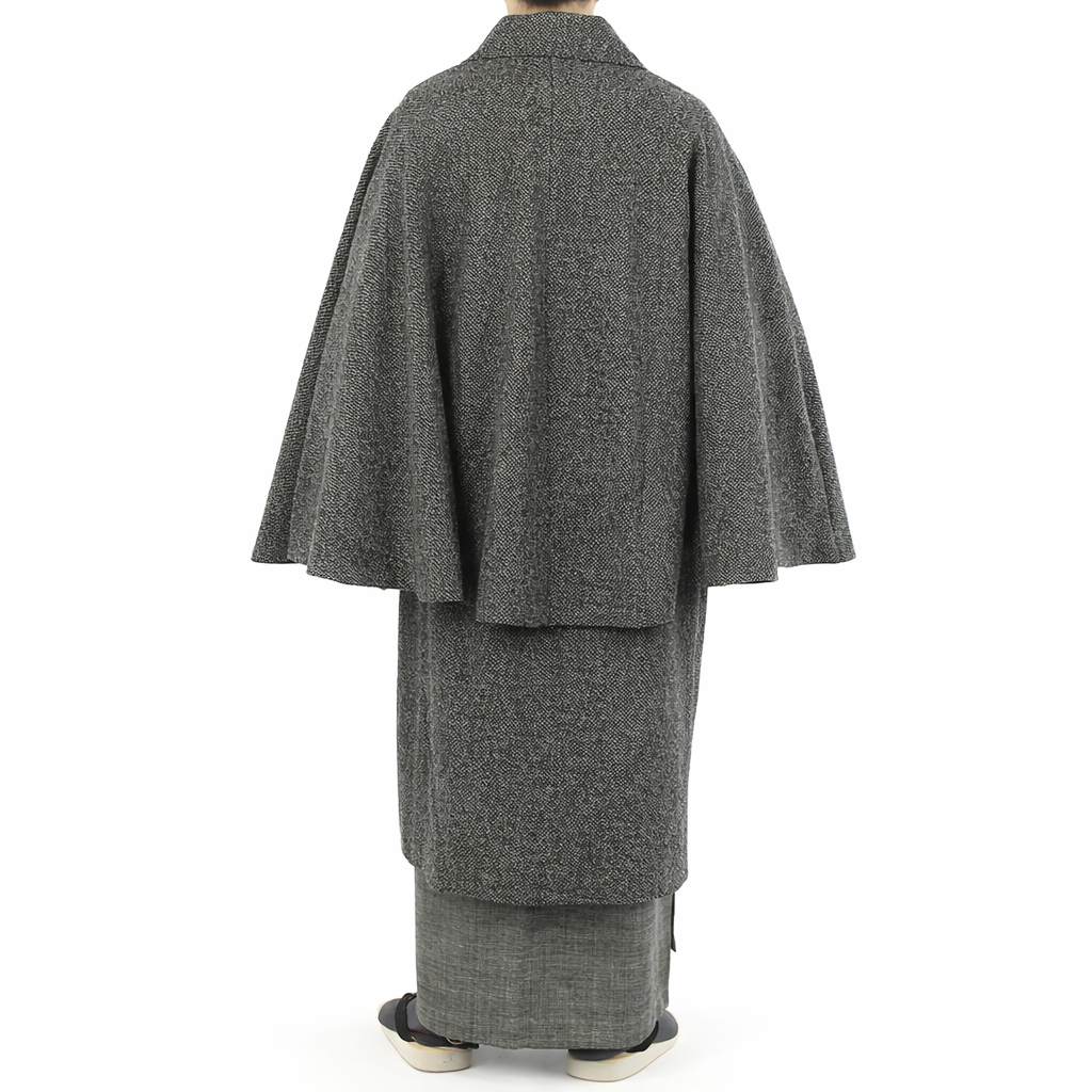 トンビコートや二重回しとも呼ばれるこちらのお品はボタン掛けの長いベストにマントが一体化しており、袖がゴワゴワせず動きやすい機能的な仕立てになっています。