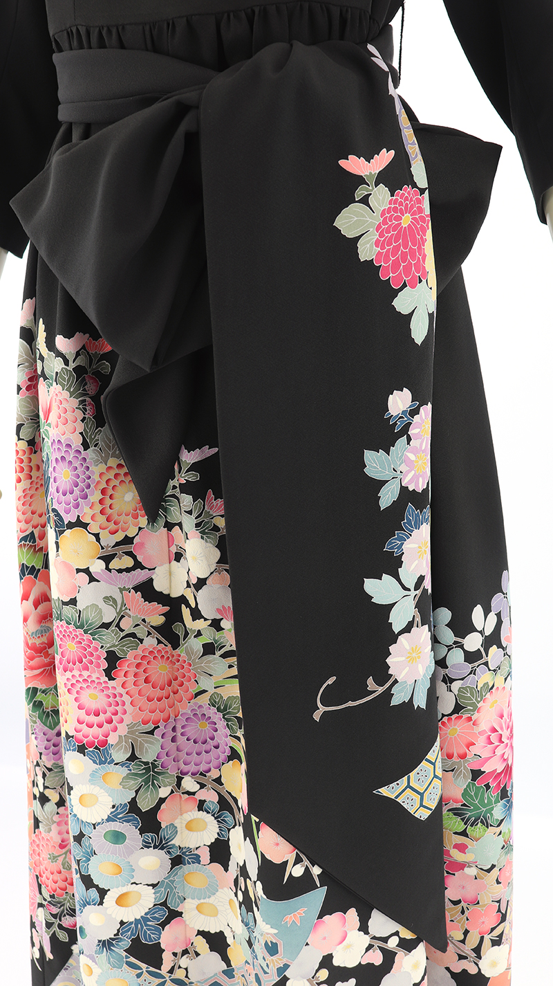 シックな黒地をベースに、裾へと広がる色とりどりの花柄が美しく映え、和の気品とモダンなエレガンスを兼ね備えた一着となっています。
