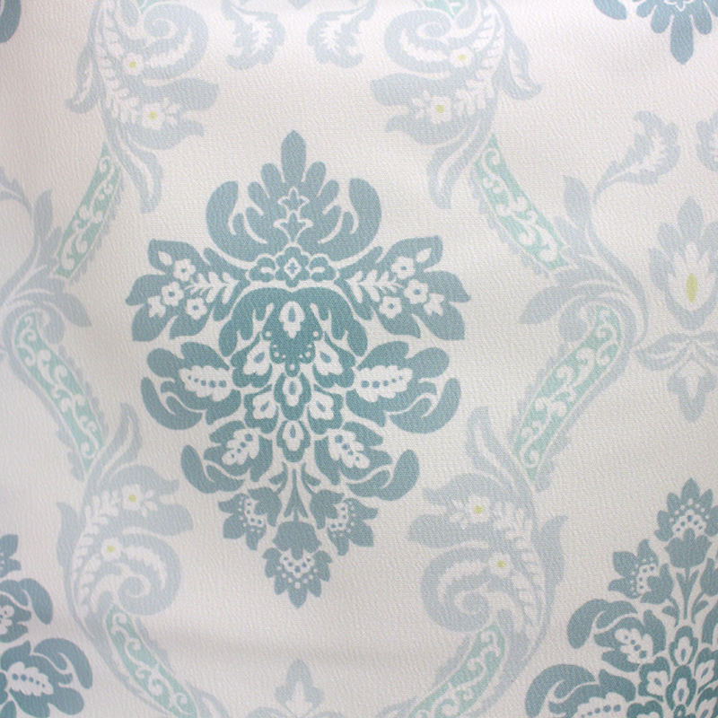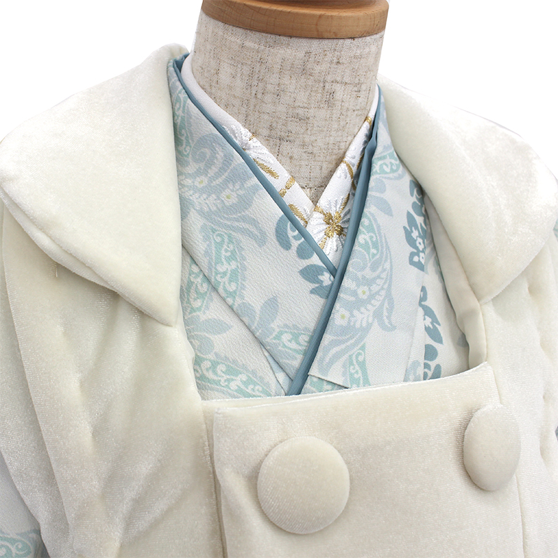 くすみブルーのダマスク柄が配された白地のお着物に、ふんわりとしたベロア調のオフホワイトの被布コートを合わせたおしゃれなお品です。