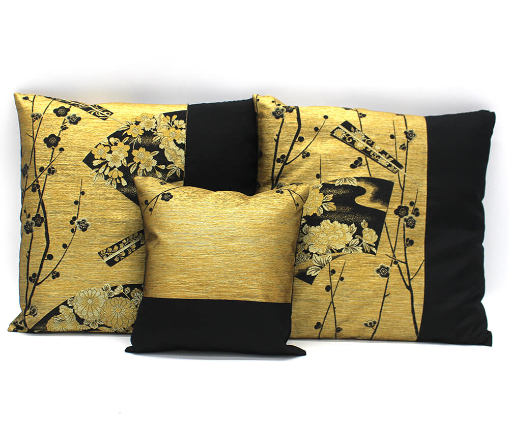 このクッションカバーは、リメイクされた帯から作られています。